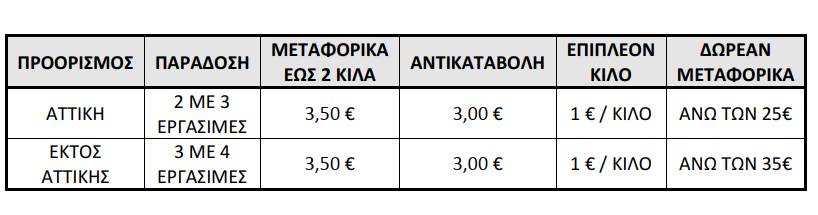 Η παραγγελία σας αποστέλλεται με τα ΕΛΤΑ Courier ¨Πόρτα-Πόρτα¨ σε όλη την Ελλάδα και με χρεώσεις όπως φαίνεται στον παρακάτω πίνακα.